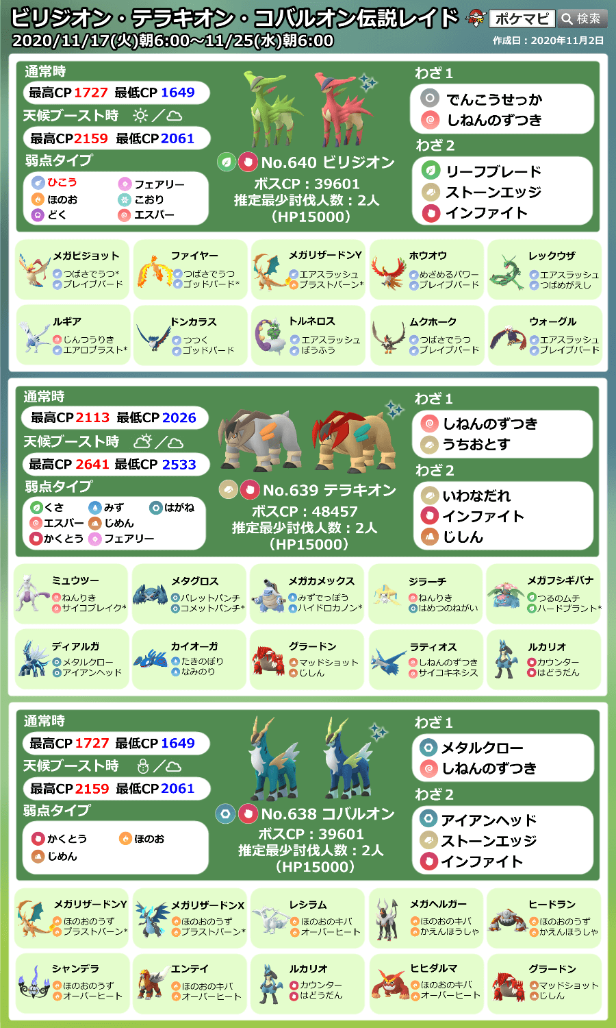 Twitter 上的 ポケモンgo攻略情報 ポケマピ 星5レイドボス変更に伴ってレイドボスが変更されています この後 11月17日 火 朝8時以降 イベント開始に伴い 再度変更されます レイドボスと最大cp一覧はこちら T Co Mwhywbjspv 招待レイド掲示板は